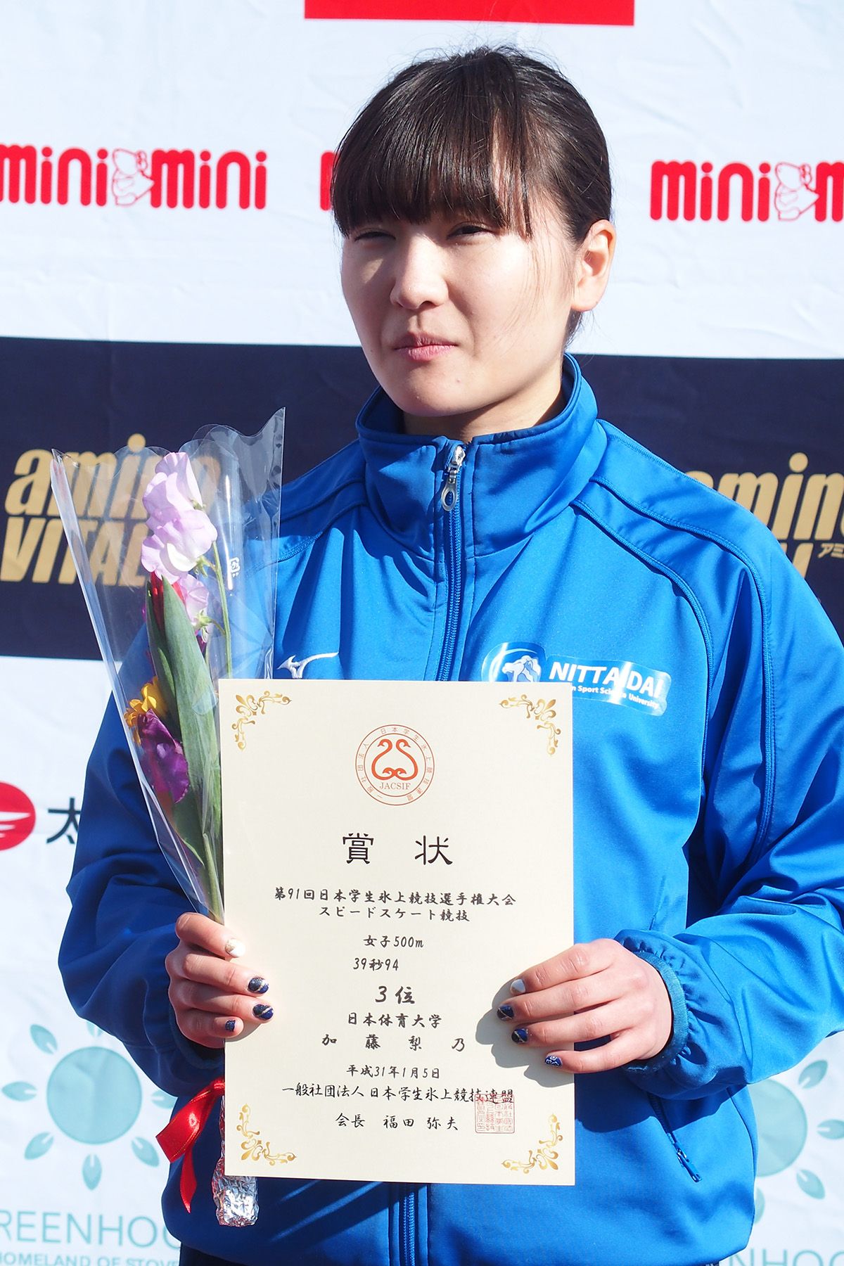 女子500m表彰式=加藤梨乃選手(日体大)