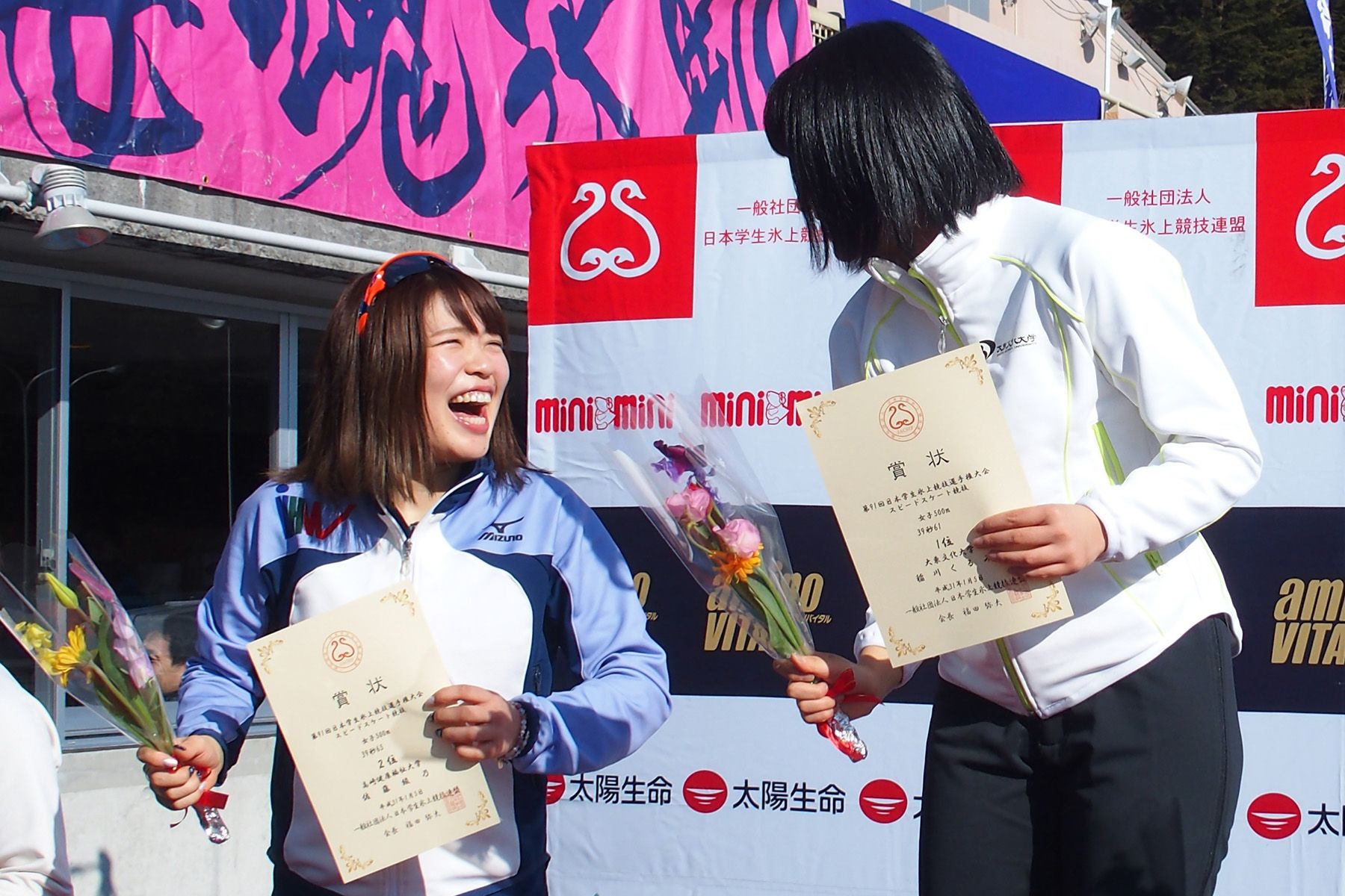 女子500m表彰式=佐藤綾乃選手(高崎健大)・稲川くるみ選手(大東文化大)