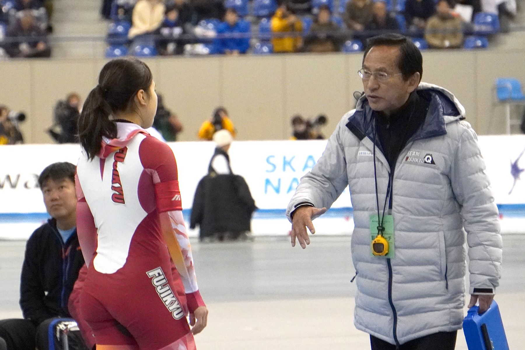 女子スプリント500m=今村俊明監督(日本電産サンキョー)・山根佳子選手(高鈴レジャーセンター)・髙木菜那選手(日本電産サンキョー)