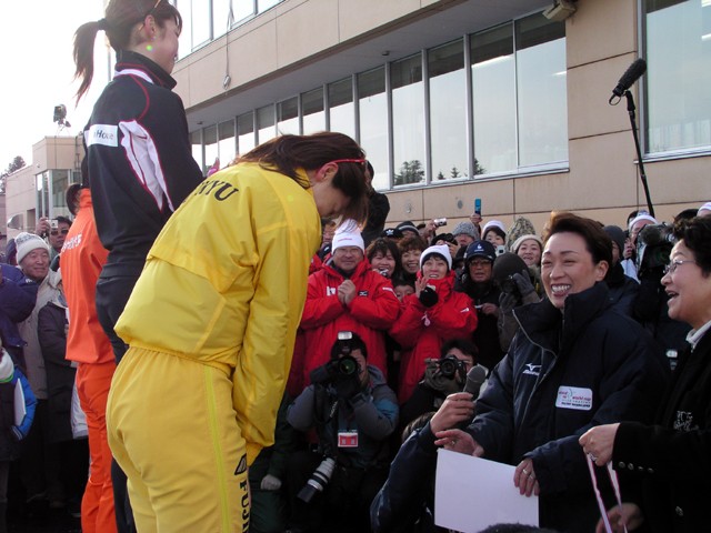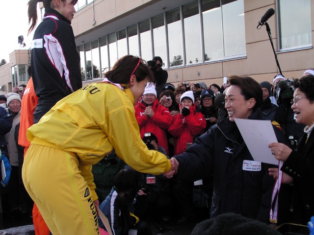 大菅小百合選手(大和ハウス工業)・岡崎朋美選手(富士急行)と橋本聖子連盟会長