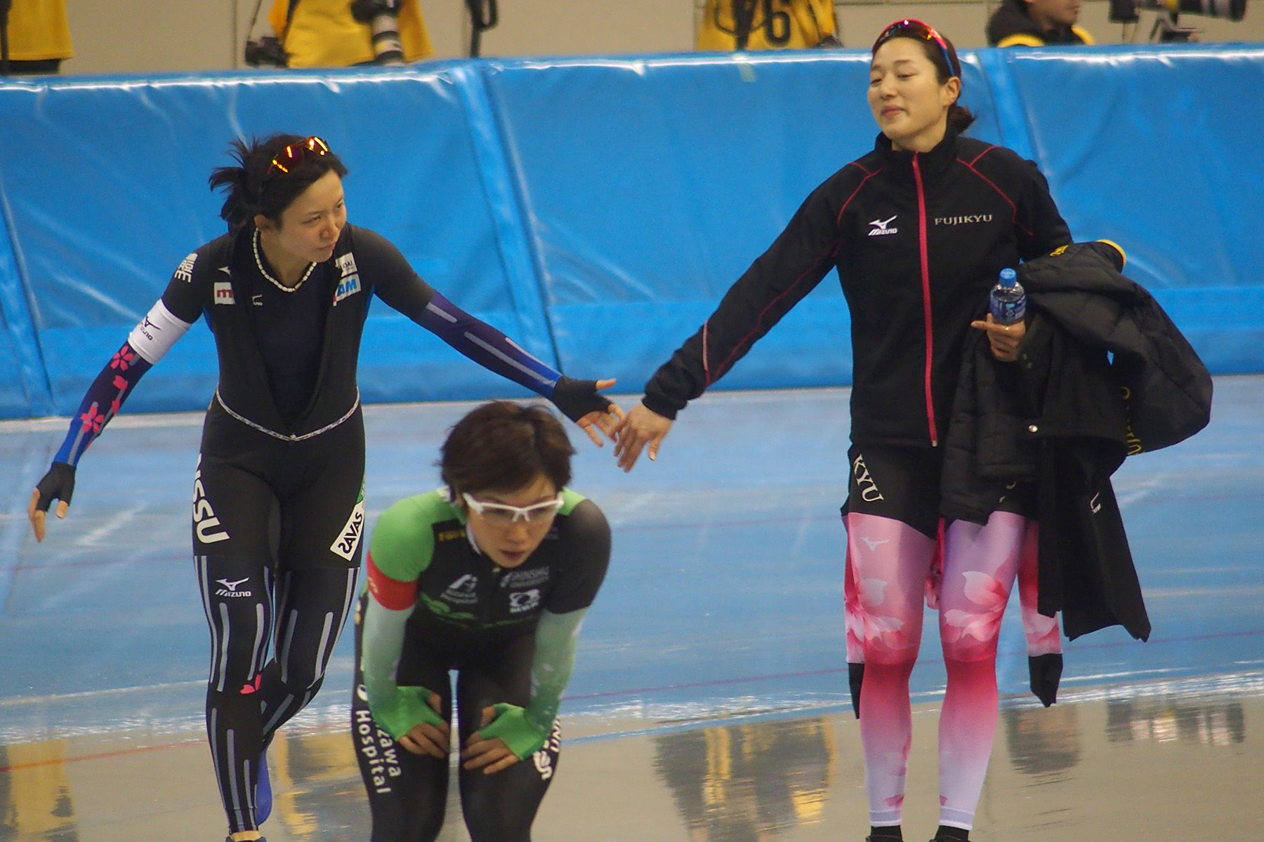 握手する髙木美帆選手(日体大助手)と菊池彩花選手(富士急行)、前は小平奈緒選手(相澤病院)