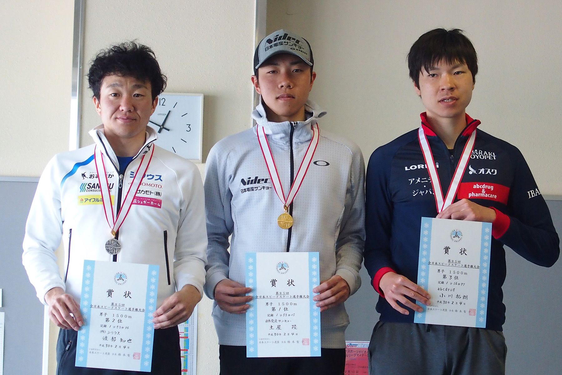 男子1500m表彰式=渡部知也選手(シリウス)・土屋陸選手(日本電産サンキョー)・小川拓朗選手(abcdrug)
