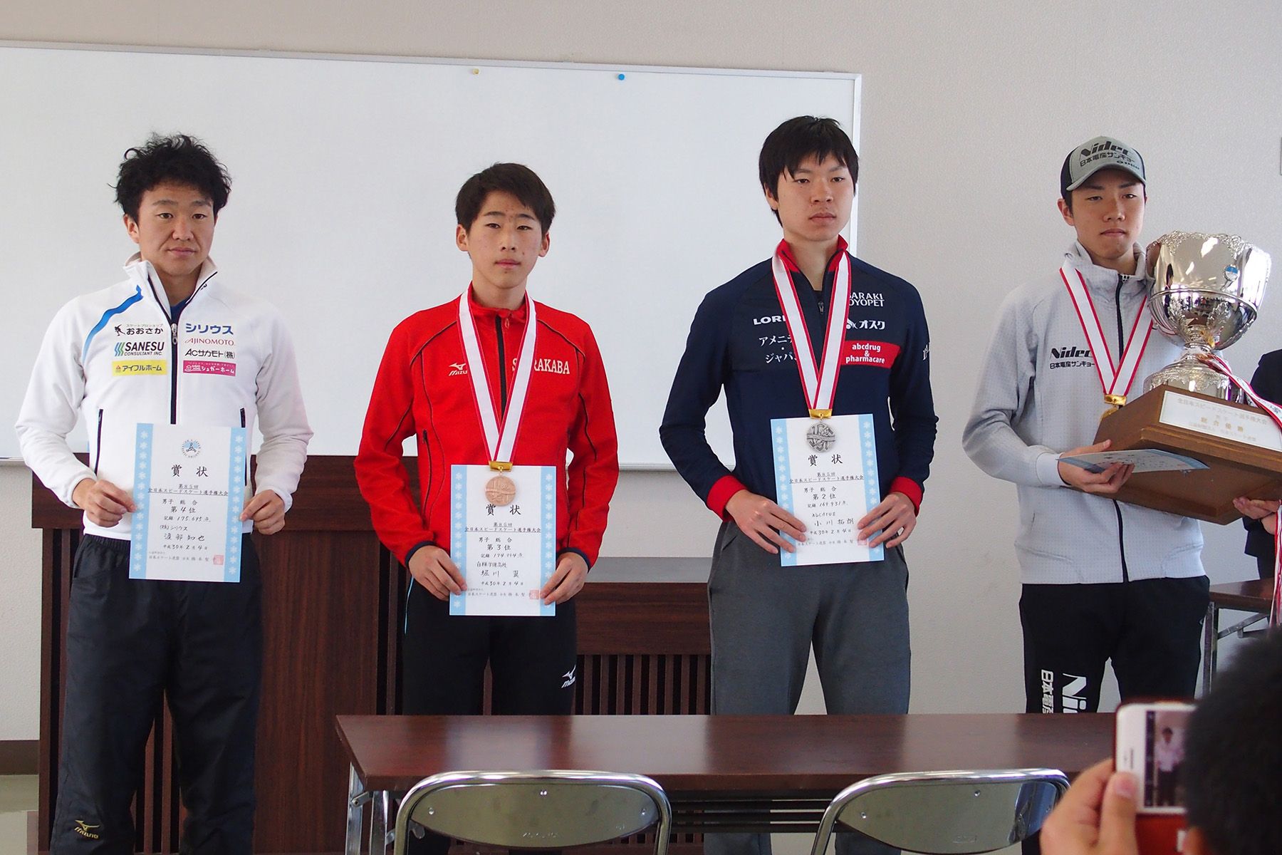 男子総合表彰式=渡部知也選手(シリウス)・堀川翼選手(白樺学園高)・小川拓朗選手(abcdrug)・土屋陸選手(日本電産サンキョー)