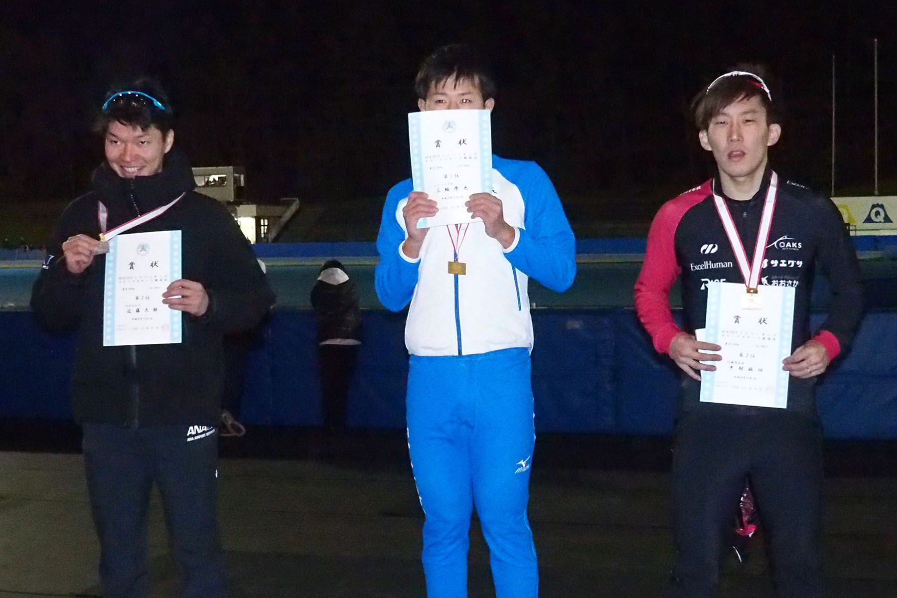男子1000m表彰式=近藤太郎選手(ANAエアポートサービス)・三輪準也選手(フィットラボ)・中村駿佑選手(EH)