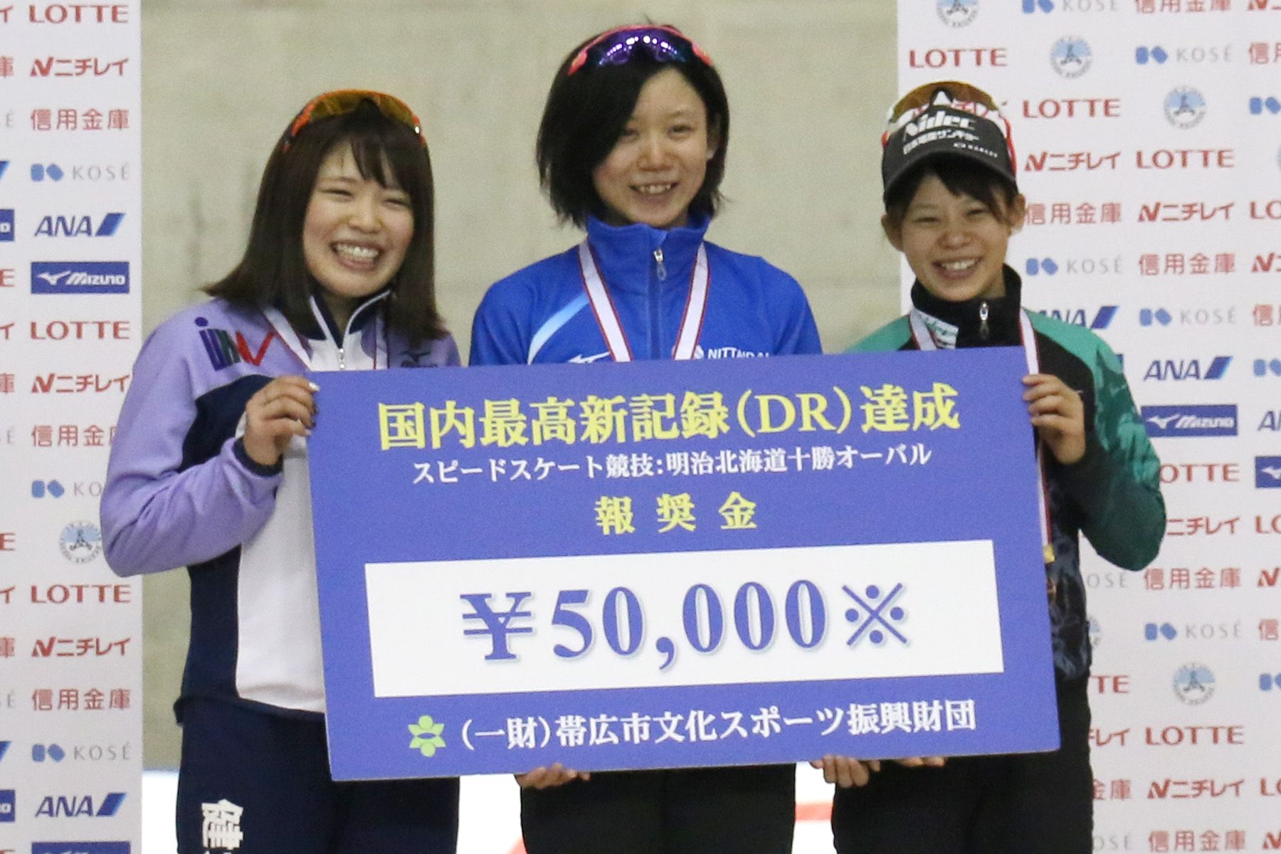 女子3000m表彰式=佐藤綾乃選手(高崎健大)・髙木美帆選手(日体大)・髙木菜那選手(日本電産サンキョー)