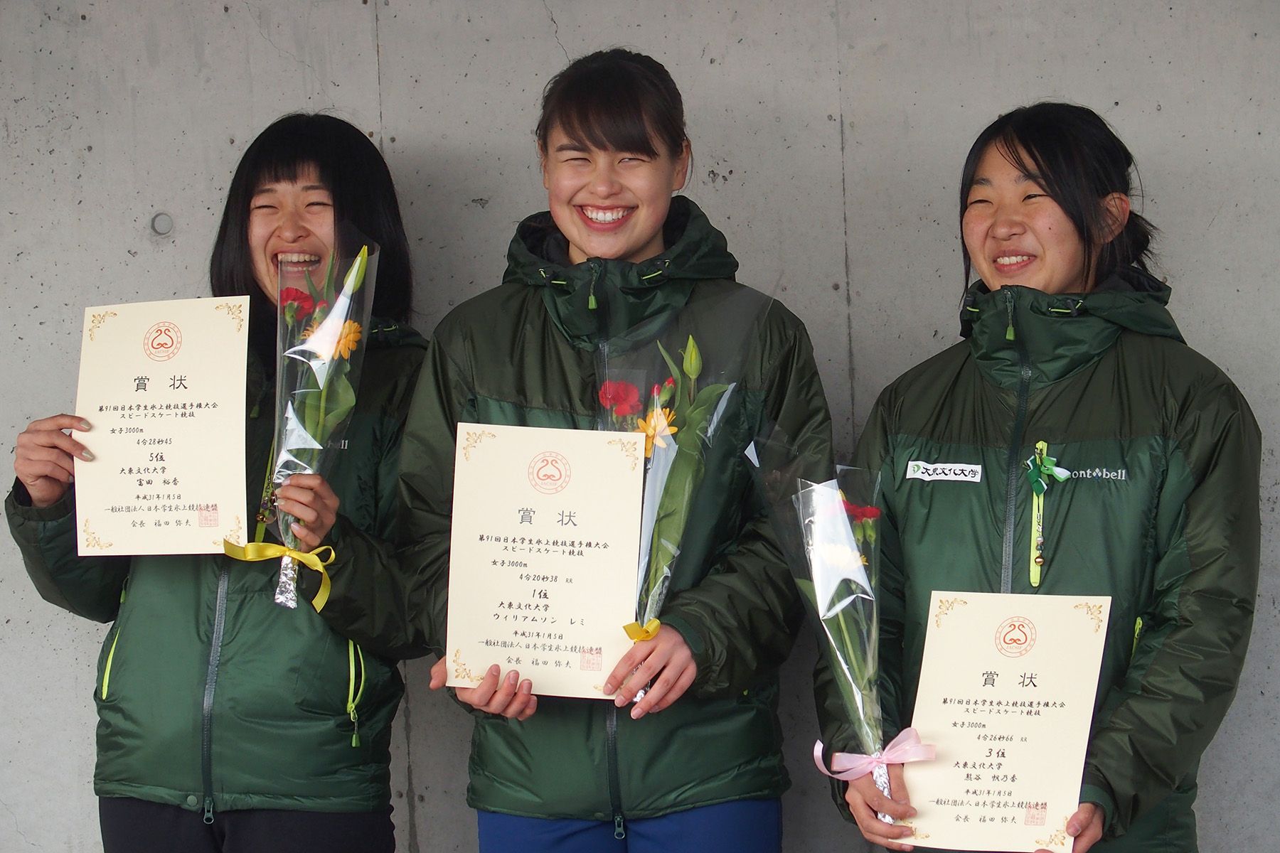 女子3000m表彰式後の富田裕香選手(大東文化大)・ウイリアムソンレミ選手(大東文化大)・熊谷帆乃香選手(大東文化大)
