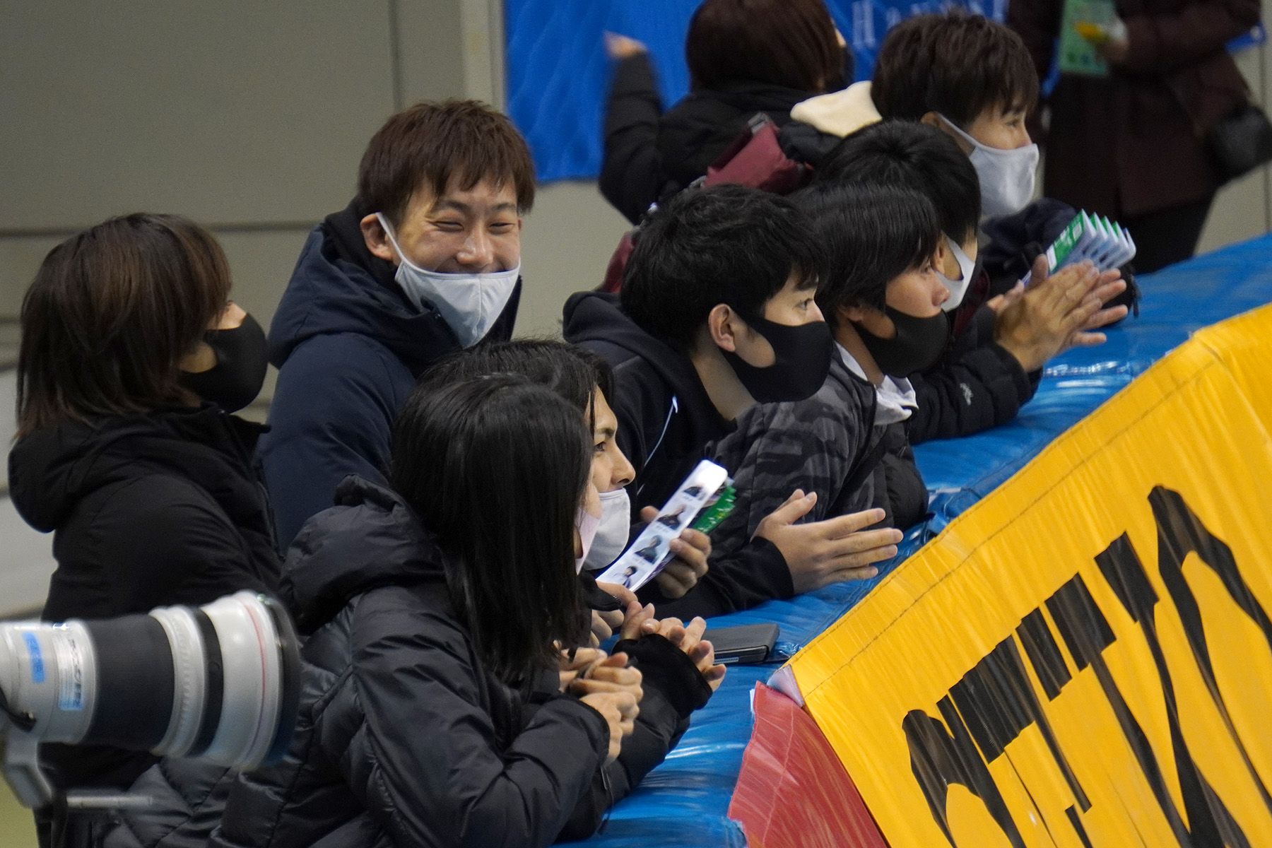 男子1500m=リンクサイドから声援を送る中村駿佑選手(EH)ら
