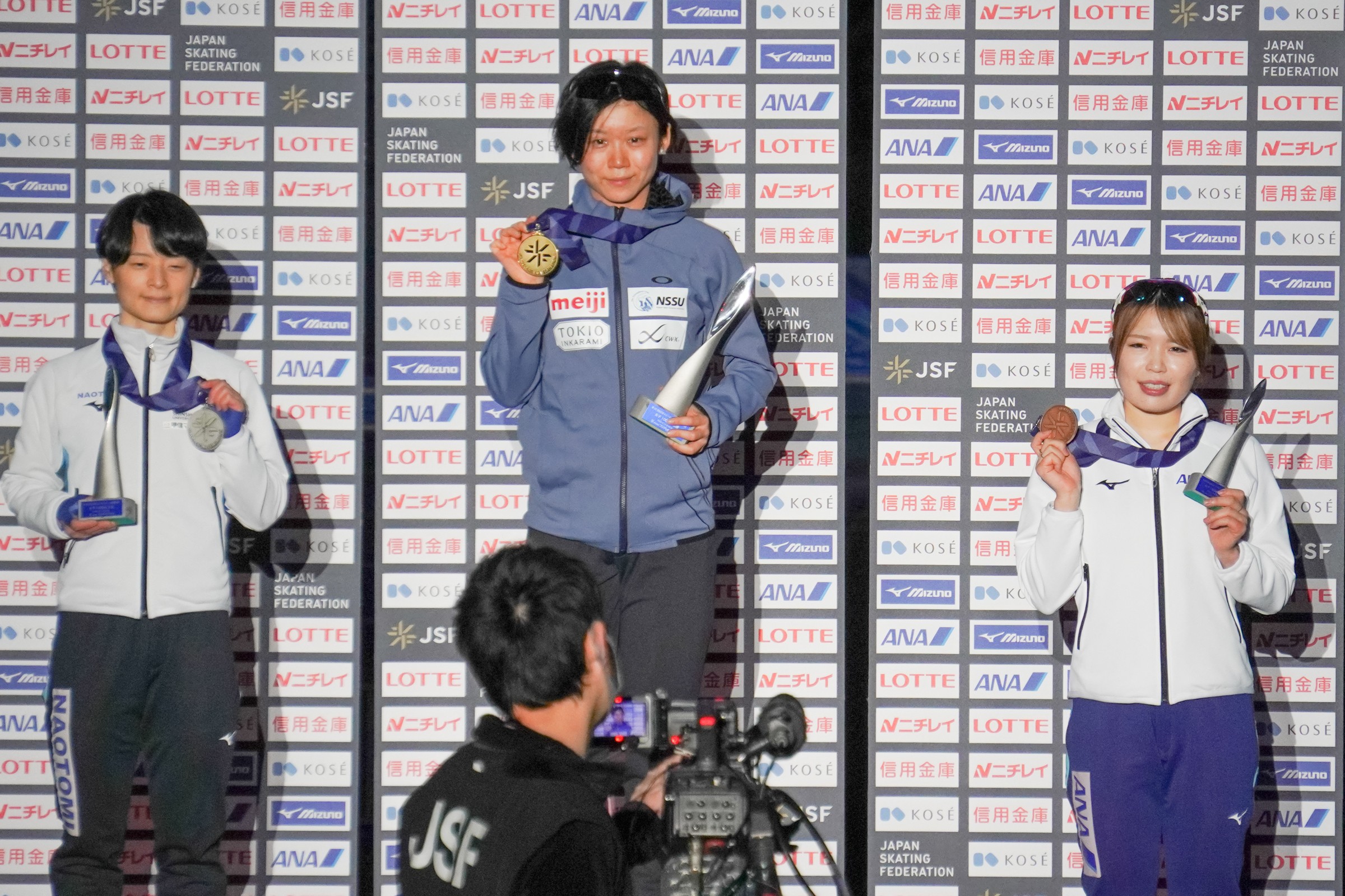 女子1000m表彰式=山田梨央選手(直富商事)・髙木美帆選手(日体大)・佐藤綾乃選手(ANA)
