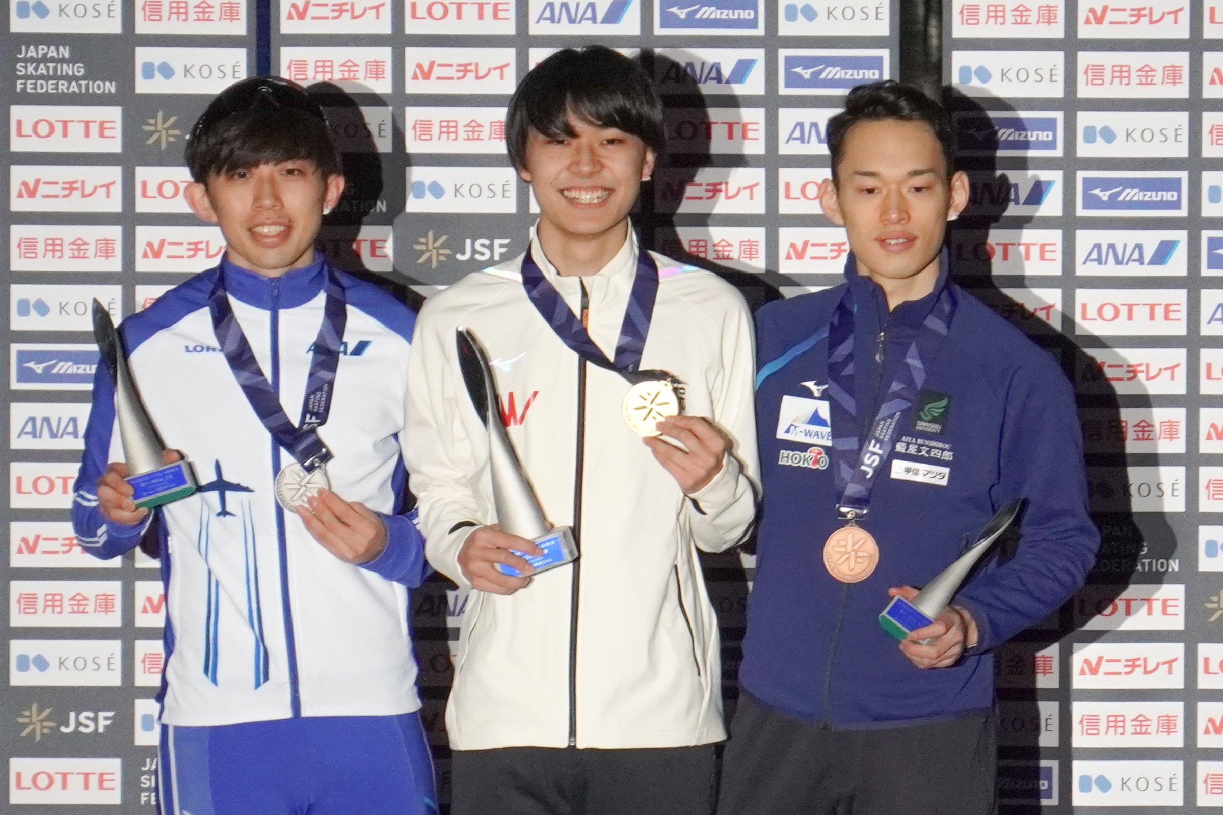 男子1500m表彰式=一戸誠太郎選手(ANA)・山田和哉選手(高崎健大)・小島良太選手(エムウェーブ)