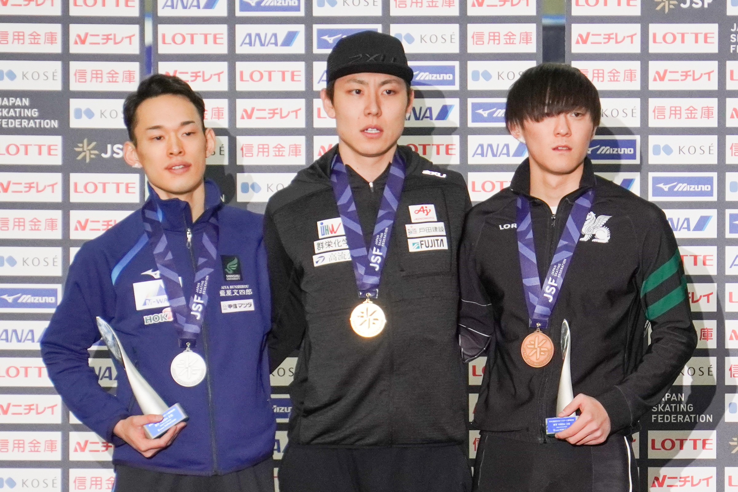 男子1000m表彰式=小島良太選手(エムウェーブ)・新濱立也選手(高崎健大)・野々村太陽選手(専修大)