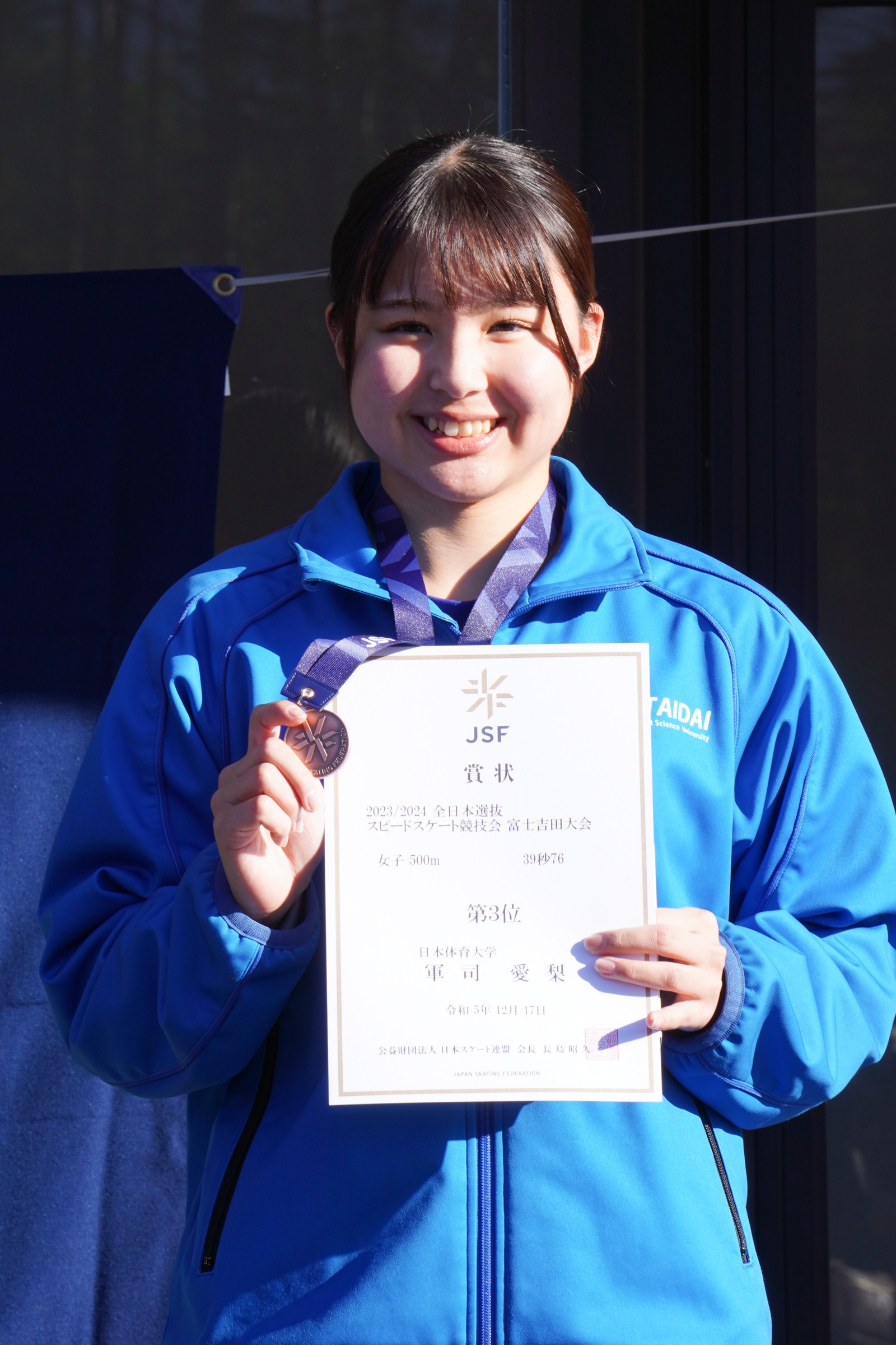 女子500m表彰式を終えて=軍司愛梨選手(日体大)