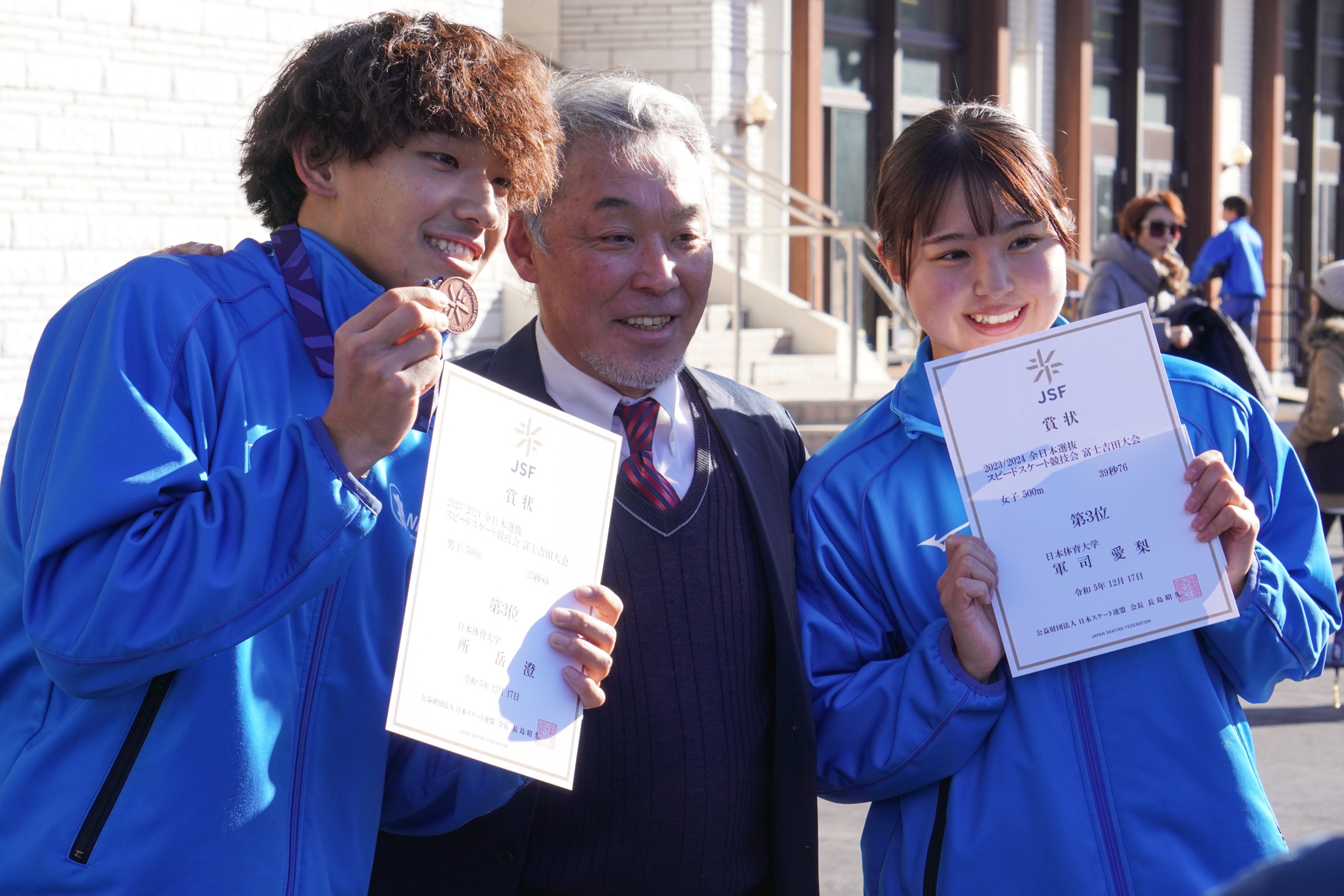 男女500m表彰式を終えて=所岳澄選手(日体大)・青柳徹監督(日体大)・軍司愛梨選手(日体大)