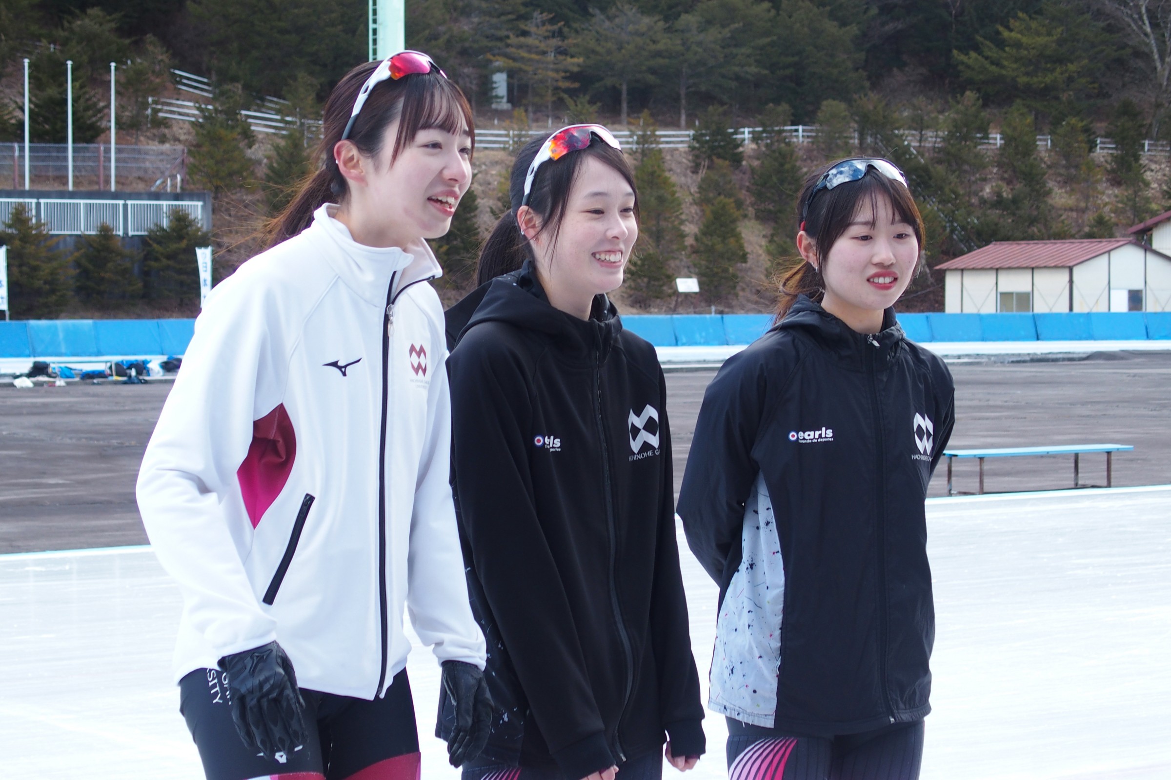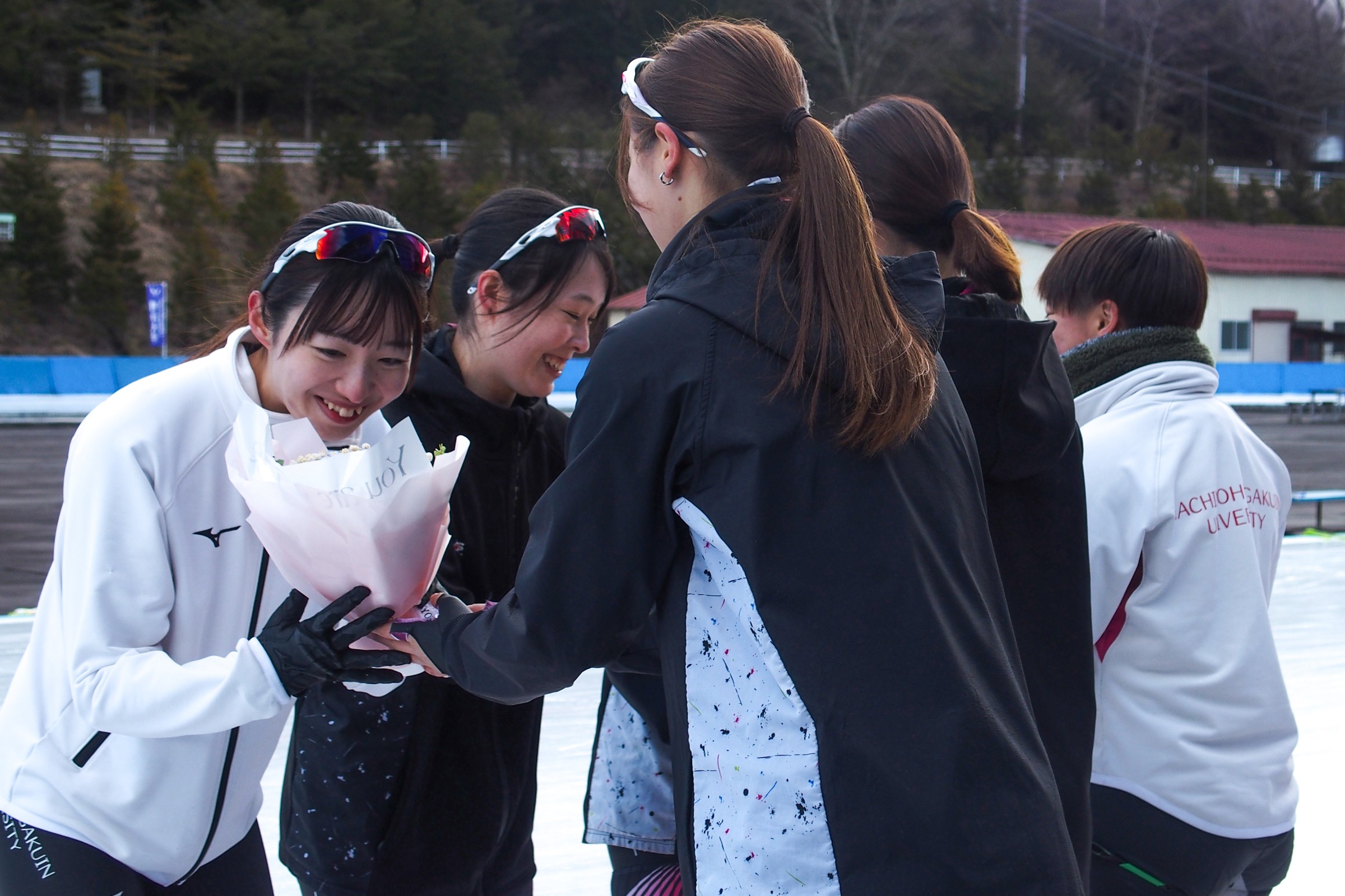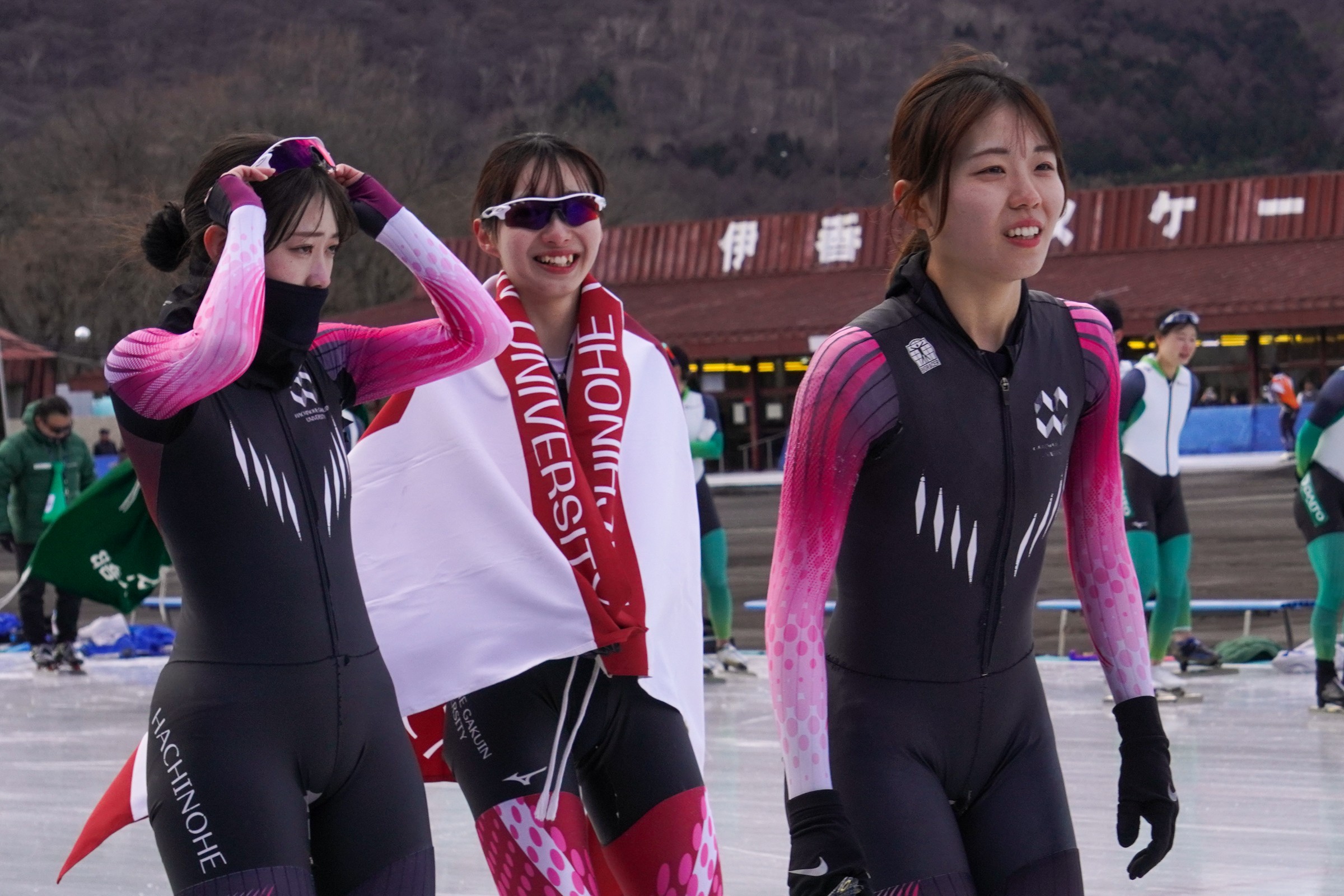全競技終了後=卒業する上野恵理子選手(八戸学院大)・安田彩夏選手(八戸学院大)・宮澤茉那選手(八戸学院大)